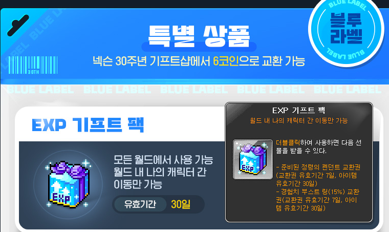 EXP 기프트팩은 쿠폰을 발급받은 넥슨 ID당 1개만 사용가능합니다