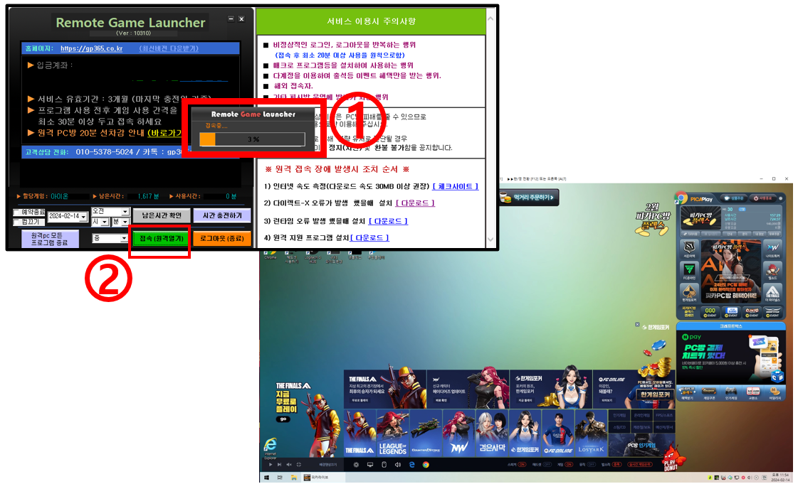 원격으로 실제 운영중인 pc방 자리로 연결되어 프리미엄혜택을 받을 수 있는 시스템입니다